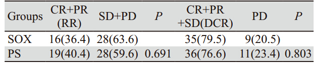 表 2 SOX和PS组患者有效率及疾病控制率比较[n(%)] Table 2 Comparison of response rates and desease control rates between SOX and PS groups[n(%)] |