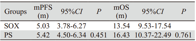 表 3 SOX组与PS组患者中位无疾病进展时间及中位生存时间的比较 Table 3 Comparison of mPFS and mOS between SOX and PS groups |