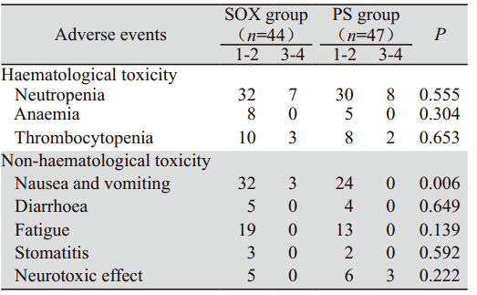 SOX组和PS组的血液学不良反应主要是中性 粒细胞减少,多为1~2度,3~4度中性粒细胞减少分别为15.9%和17.0%,3~4度血小板减少分别为 6.8%和4.3%,经相应的对症处理后绝大多数患 者均能耐受,两组血液学不良反应比较差异均无 统计学意义(P>0.05)。SOX组和PS组的非血液 学不良反应主要是胃肠道反应、乏力;SOX组和 PS组的恶心、呕吐发生率分别为79.5%和51.1%(P <0.05);PS组有3例患者出现3度神经毒性(肢体 疼痛难以忍受,夜间难以入眠,经对症治疗后症 状减轻),SOX组和PS组的神经毒性发生率分别为 11.4%和19.1%(P>0.05);腹泻、口腔炎、乏力不 良反应发生率低,且多为1~2度,差异无统计学意 义。无一例因不良反应而终止治疗,全组无治疗 相关性死亡,见表 4。