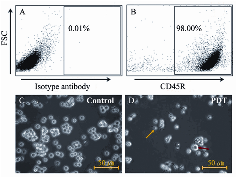 CD45R was highly expressed on the surface of A20 cells(A:isotype antibody;B:CD45R antibody). Morphology of A20 cells before and after PDT were observed(C:control;D:PDT). Cellular swelling(red arrow) and shrinkage(yellow arrow) were observed simultaneously in the same field, 24h after 0.50 μg/ml Photodithazine/PDT treatment. Bar:50 μm 图 1 A20细胞株中CD45R的表达及形态学变化 Figure 1 CD45R expression and morphological changes in A20 cell line |