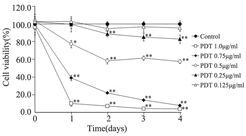 A20 cells ( 1×106) were incubated with variousdoses of Photodithazine(0.125-1.0μg/ml)for 12 h at 37℃ and exposed to 6.25 J/cm2 of laser light. The treated cells were further incubated at 37 ℃ for 4 days for WST-1 assay. (*:P< 0.05, **:P<0.01 in t-test with the control group) 图 2 Photodithazine/PDT 实施后淋巴瘤细胞的生存率 Figure 2 The survival rate of lymphoma cells after Photodithazine/PDT |
