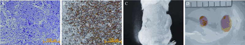自种植1×106的A20细胞4日起可触及皮下结 节,约16日时肿瘤长轴可达8 mm,边界清楚, 见图 4A、4B。形成肿瘤后处死部分实验动物, 提取种植物进行了形态学观察。HE染色显示: 光学显微镜下瘤细胞大小比较一致,弥漫分布, 核大深染,核圆形、卵圆形或不规则形,核染色 质不均匀,胞质极少;用CD45R免疫组织化学染 色后见:所有肿瘤细胞表面深染为棕色,强表达 CD45R,见图 4C、4D。