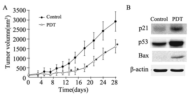 光动力治疗后,对照组肿瘤仍继续增大, 各径线变长,较对照组PDT组平均肿瘤生长缓 慢,自2周始肿瘤体积减小,差异有统计学意义 (P<0.05),见图 5。从肿瘤组织中提取的蛋白质 表达分析示:P21、P53、Bax 等蛋白的表达比对 照组增加。
