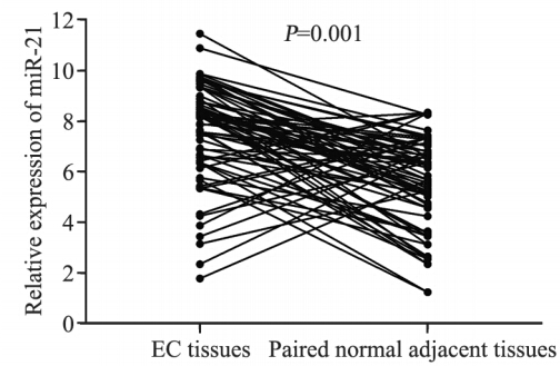 图 1 miR-21在食管癌和正常食管组织中的表达 Figure 1 miR-21 expression in 72 pairs of EC and adjacent normal esophageal tissues detected by quantitative realtime polymerase chain reaction (qRT-PCR) analysis |
