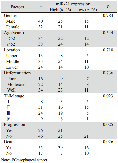 表 1 miR-21在食管癌组织中的表达及其与临床病理因素之间的关系 Table 1 Association between miR-21 expression and conventional clinicopathologic parameters in 72 EC patients |