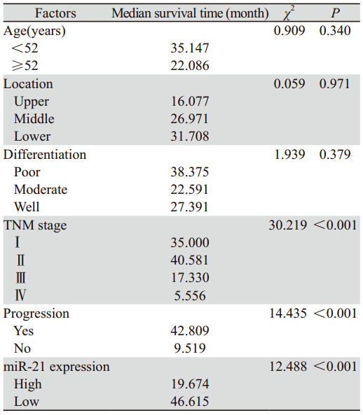 表 2 miR-21及一般临床病理因素在食管癌患者预后中的单因素分析 Table 2 Univariate analysis of miR-21 expression and general clinicopathologic parameters in the prognosis of EC patients |