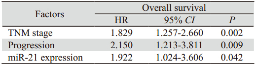 表 3 miR-21及一般临床病理因素在食管癌患者预后中的多因素分析 Table 3 Multivariate analysis of miR-21 expression and general clinicopathologic parameters in the prognosis of EC patients |