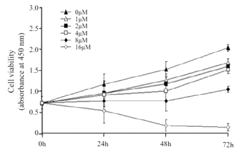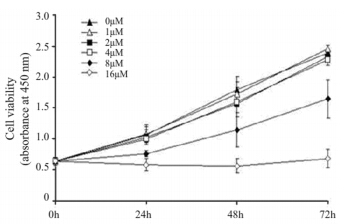 SW579和HUVEC分别以L-15培养液(100%空 气、37℃)和RPMI1640培养液(5%CO2、37℃) 培养,培养液含10%胎牛血清、100 u/ml青霉素和 100 μg/ml链霉素。细胞经传代培养、液氮冻存备 用。每次实验前将细胞复苏、培养,以一定的细 胞密度接种于96孔板或细胞培养皿用于实验。所 有实验均采用同一代细胞。 1.3 CCK-8法测定细胞活度