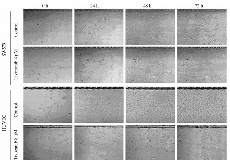 临床前实验研究显示,作为一种TKI,替沃 扎尼可抑制多种肿瘤细胞和VEC的增殖及肿瘤 血管生成[12]。国内也已完成了该药的实验室合成工作[16]。本研究结果显示,替沃扎尼对SW579和 HUVEC的增殖均具有明显的抑制作用,其生长 抑制作用均呈时间和浓度依赖性,对SW579和 HUVEC的半数生长抑制浓度(IC50)分别约为4 μM和8 μM。SW579和HUVEC在其IC50作用下生长 增殖均受到明显的抑制,MI明显下降。