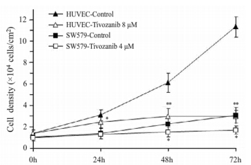 | 图 4 替沃扎尼抑制SW579和HUVEC的增殖 Figure 4 Tivozanib inhibited the proliferation of SW579 and HUVEC |