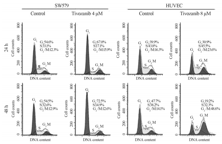 | 图 5 SW579和HUVEC分别被替沃扎尼休止于细胞周期的G1期和G2/M期 Figure 5 Tivozanib arrested cell cycles of SW579 and HUVEC at G1 and G2/M phases respectively |