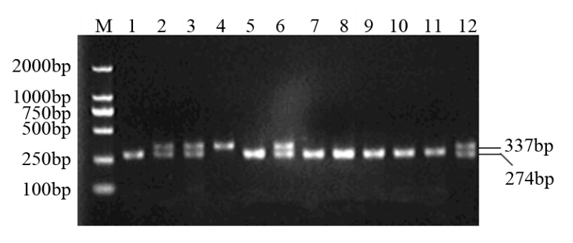 | M: PCR marker DL2000; 1,5,7-11: CC genotype; 2,3,6,12: CT genotype; 4: TT genotype图 1 部分标本TLR3c.1377基因分型PCR产物TaqⅠ酶切电泳结果 Figure 1 The electrophoresis results of TaqⅠrestriction endonuclease digestion after PCR for TLR3c.1377 genotyping in part of specimens |