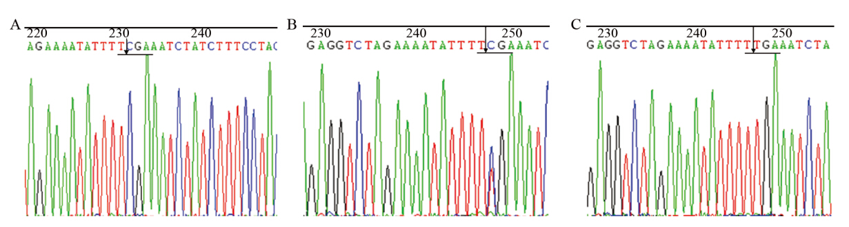 选取上述部分CC、TT和CT基因型标本PCR产物进行测序分析,测序结果与GenBank TLR3标准型(野生型)DNA序列比较,显示与PCR-RFLP鉴定结果一致。3种基因型各1例标本测序结果见图 2。