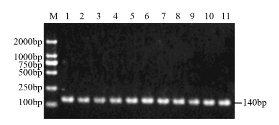 本研究中所有胃癌患者和健康对照组PCR产物酶切后,其电泳条带仍为140 bp,即均为野生型Asp/Asp基因型(χ2=0,P>0.05),表明胃癌患者和健康对照组TLR4 Asp299Gly位点均未出现A→G突变。部分标本PCR产物的酶切电泳结果见图 3。