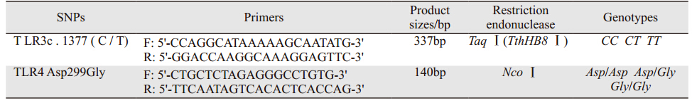 TLR4基因Asp299Gly多态性PCR反应体系与TLR3c.1377多态性检测相同。采用限制性内切酶NcoⅠ酶切上述PCR产物,酶切体系20 μl,包括10×K Buffer 2 μl,10 u/μl NcoⅠ1 μl,PCR产物10 μl,无酶双蒸水7 μl。混匀后瞬时离心,37℃水浴30 min。酶切产物于含溴化乙锭(0.5 µg/ml)的2%琼脂糖凝胶中电泳,凝胶成像系统记录实验结果。