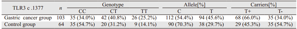 对上述TLR3c.1377基因多态性检测结果进行分析显示,胃癌组与对照组之间TLR3c.1377基因型频率差异有统计学意义(χ2=7.36,P=0.025)。胃癌组T等位基因频率高于对照组(46.5% vs.29.7%,χ2=8.40,P=0.004)。胃癌组T等位基因携带者的频率高于对照组(66.0% vs.45.3%,χ2=6.96,P=0.008,OR=2.435,95% CI: 1.238~4.443),见表 2。