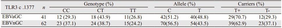 进一步比较EBVaGC和EBVnGC组织中TLR3 c .1377基因多态性差异。统计分析显示两组间TLR3 c .1377基因型频率(χ2= 0 .6 7 6,P=0.713)、T等位基因频率(48.8% vs. 43.5%,χ2=0.545,P=0.461)及T等位基因携带者的频率(70.7% vs. 62.9%,χ2=0.674,P=0.412)差异无统计学意义,见表 3。