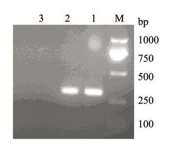 收集重组腺病毒感染后DC,提取细胞RNA,RT-PCR扩增出大小约309 bp的特异性条带,见图 2。