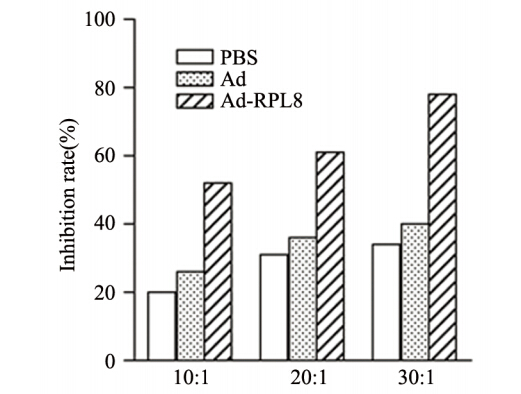 感染后DC与T细胞以1:3比例混匀在培养箱内培养72 h。分别按效靶比为10:1、20:1、30:1加入培养于96孔板的GL261胶质瘤细胞中,每组设3个复孔。培养48 h后,每孔加入5 mg/ml MTT各20 μl,继续培养4 h,加入100 μl DMSO,570 nm波长处测定各组的OD值。T细胞对肿瘤细胞的杀伤效应用抑制率表示,抑制率=[靶细胞对照组A值-(实验组A值-效应细胞对照组A值)]/(靶细胞对照组A值)×100%。1.5 RPL8基因修饰DC对胶质瘤的免疫效应