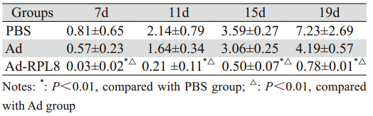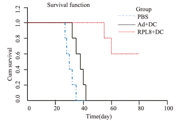 将GL261细胞培养传代,调整细胞浓度为1×107/ml,将细胞悬液接种于C57BL/6小鼠右前腋下,每只0.2 ml(2×106个细胞),隔天观察肿瘤的生长情况,一般5天后可在注射部位摸到米粒样大小的包块,即为荷瘤模型。荷瘤5天后,尾静脉注射RPL8基因修饰DC,每只200 μl。同时设空载体对照和PBS对照,每组5只。每周1次,共3次,每隔3天观察肿瘤体积变化及小鼠的生存情况,取瘤体进行石蜡包埋、病理切片、HE染色。1.6 统计学方法