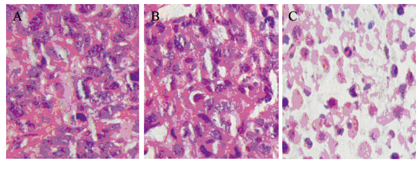 | A: PBS group. Nuclear marked heterogeneity,large nuclei and deep staining,cells arranged in disorder; B: Ad group:DCs infected by Ad. Nuclear marked heterogeneity,large and hyperchromatic nucleus,showing invasive growth; C: Ad-RPL8 group: DCs infected by Ad-RPL8. Tissue interstitial lymphocytes,dissolve and focal necrosis图 5 各组荷瘤小鼠肿瘤组织病理学检查结果(HE ×200)Figure 5 Pathological examination of mice tumor tissues (HE ×200) |