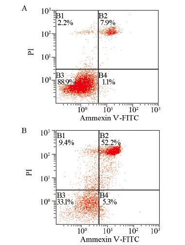 | A: transfected with blank plasmid; B: transfected with IL-1RAP 图 1 转染IL-1RAP对U251细胞凋亡的影响 Figure 1 The impact of IL-1RAP transfection on U251 cell apoptosis |