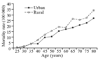 河南省1988-2012年合计女性乳腺癌死亡率 为5.06/10万,中标率为4.03/10万,居女性癌症死 因的第5位,占女性癌症死亡总数的5.51%。城 市地区女性乳腺癌死亡率为4.75/10万,中标率为 3.76/10万,居城市女性癌症死因的第6位,占女 性癌症死亡总数的7.41%。农村地区女性乳腺癌 死亡率为5.08/10万,中标率为4.07/10万,居农村 女性癌症死因的第5位,占女性癌症死亡总数的 5.42%。城市农村地区各时期的女性乳腺癌死亡 率自1988—1992年到2008—2012年呈逐渐上升趋 势,见表 1。2008—2012年城市、农村乳腺癌年 龄别死亡率显示,在30岁年龄组以前死亡率处于 较低水平,此后死亡率随着年龄的增长而快速上 升,在80岁以上年龄组达到最高水平,城市、农 村地区在80岁以上年龄组的死亡率分别为27.03/10 万和34.00/10 万,见图 1 。