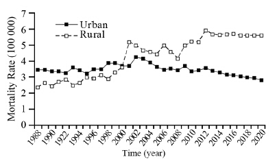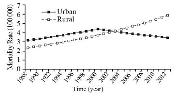 城市地区的乳腺癌死亡率变化趋势中, 1988—2000年与2000—2012年两个时间段APC变化之间的差异有统计学意义,1 9 8 8—2 0 0 0 年和2000—2012年两个时间段的EAPC分别为 2.8%和-2.0%,95%置信区间分别为0.9%~4.7% 和-3.8%~-0.2%,两个时间段死亡率趋势差异均有 统计学意义。农村地区女性乳腺癌死亡率时间变 化趋势中,1988—2012年EAPC为3.9%,95% 置信 区间为3.2%~4.5%,其上升趋势有统计学意义, 见图 2。