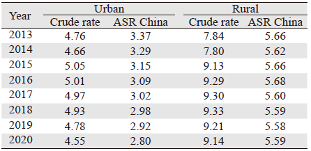 采用年龄-时期-队列的贝叶斯模型对未来8年 (2013—2020年)城市、农村地区乳腺癌死亡率 进行预测,预测结果显示,城市女性乳腺癌的预 测标化率呈下降趋势,而农村地区无明显上升或 下降趋势,见图 3。2013—2020年,城市地区乳 腺癌粗死亡率变化不大,而农村地区粗死亡率从 7.84/10万上升到9.14/10万,见表 2。
