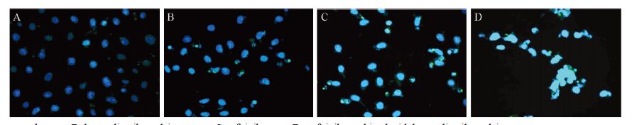 | A:control group; B: bruceolic oil emulsion group; C:gefitinib group;D: gefitinib combined with bruceolic oil emulsion group 图 2 吉非替尼和鸦胆子油乳对A549细胞诱导凋亡作用(Tunel×200) Figure 2 Effects of gefitinib and bruceolic oil emulsion on apoptosis of A549 cell line (Tunel×200) |