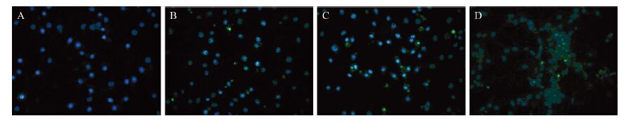 | A:control group; B: bruceolic oil emulsion group; C:gefitinib group;D: gefitinib combined with bruceolic oil emulsion group 图 1 吉非替尼和鸦胆子油乳对PC-9细胞诱导凋亡作用(Tunel×200) Figure 1 Effects of gefitinib and bruceolic oil emulsion on apoptosis of PC-9 cell line (Tunel×200) |