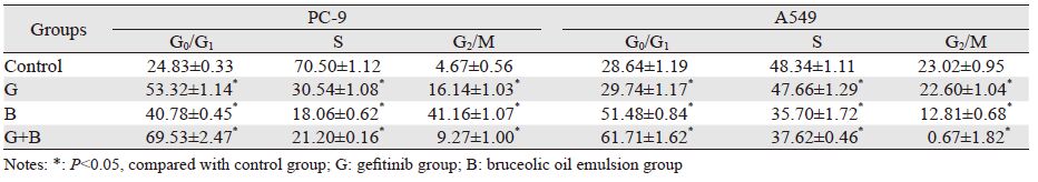1.5 流式细胞仪检测吉非替尼不同时相联合鸦胆子油乳对细胞周期的影响取对数生长期的PC-9、A549细胞分别制成每毫升1.0×105个以及每毫升5×104个细胞悬液,取5 ml接种到细胞培养瓶,置于培养箱中6 h。待细胞贴壁后按实验分组加药5 ml培养。PBS清洗,处理细胞,取1 ml细胞悬液入离心管,将离心管以1 000 r/min离心5 min,弃上清液。收集细胞,加入75%乙醇置于-20℃冰箱固定过夜,PBS清洗并加入50 μg/ml碘化丙啶(PI)和1 mg/ml RNaseA酶,避光染色30 min后通过流式细胞仪检测DNA含量,再运用计算机正态拟合分析细胞周期各时期(G0/G1期、S期和G2/M期)的分布比例。