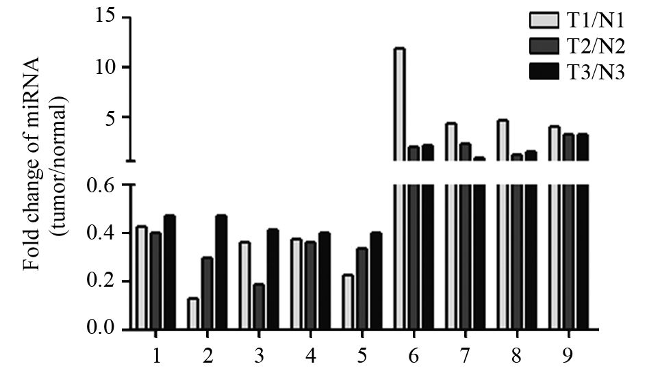 | miR-31 was up-regulated in colorectal cancer(CRC) tissues, compared with normal mucosa. T1-T3: CRC tissues; N1-N3: normal mucosa tissues; 1: miR-10a; 2: miR-10b; 3: miR-101; 4: miR-494; 5: miR-451; 6: miR-31; 7: miR-92a; 8: miR-92b; 9: miR-93 图 1 3例大肠癌患者癌组织及远端正常黏膜芯片筛选结果 Figure 1 miRNA array results of cancer and normal mucosa tissues in three CRC patients |