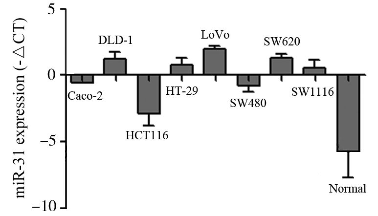 检测8种结肠癌细胞株和9例正常直肠黏膜组织中miR-31的表达(以-ΔCT表示)。相对表达量分别为Caco-2(-0.582±0.004)、DLD-1(1.219±0.536)、HCT116(-2.927±0.841)、HT-29(0.774±0.509)、LoVo(1.962±0.248)、SW480(-0.814±0.407)、SW620(1.279±0.328)、SW1116(0.576±0.551)、正常直肠黏膜(-5.781±1.929)。miR-31在结肠癌细胞株中表达均明显高于正常直肠组织,见图 2。