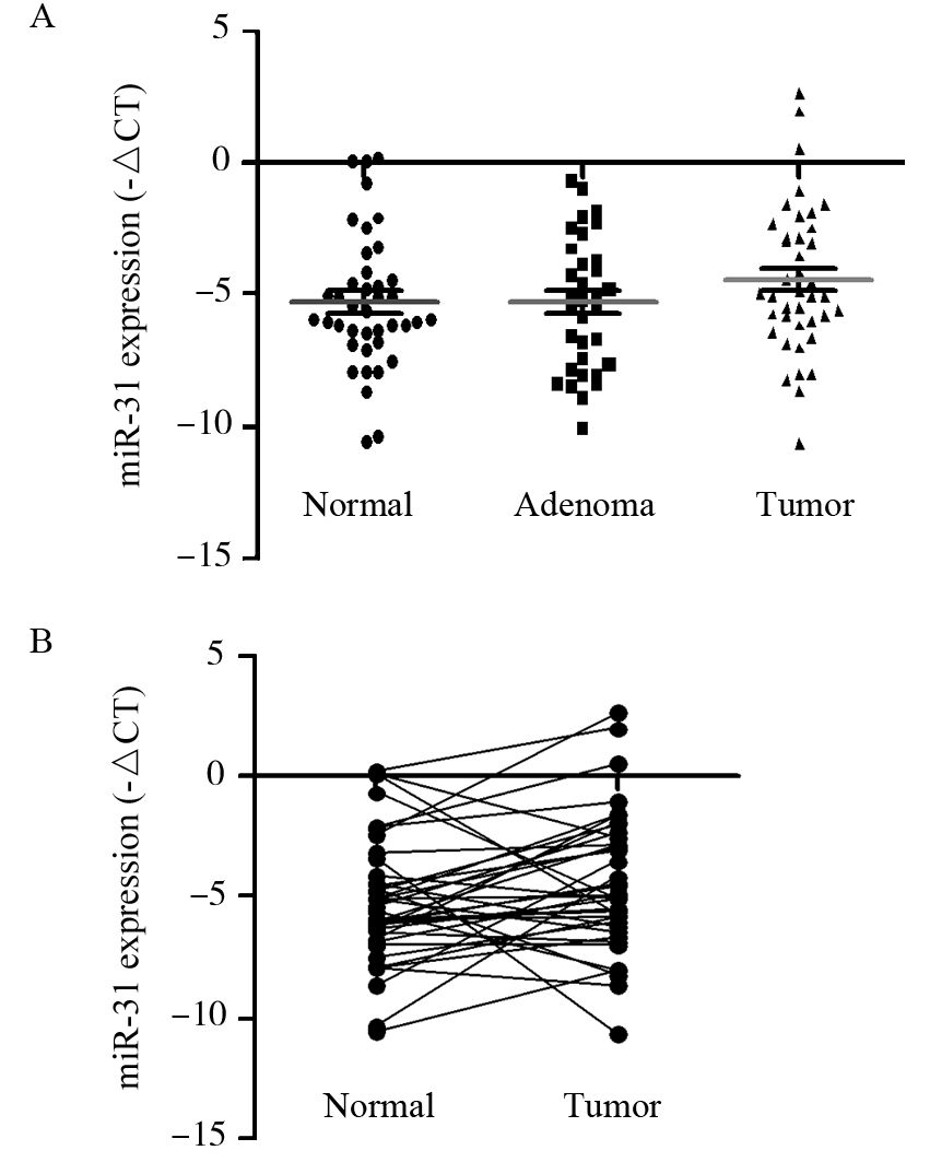 检测40例结直肠癌组织及配对远端正常黏膜组织及33例腺瘤组织中miR-31的表达水平,miR-31的表达以- ΔCT表示,分析三组标本间miR-31的差异。癌组织中miR-31的表达水平(-ΔCT=-4.33±2.63)明显高于正常黏膜组织(-ΔCT=-5.25±2.56)和腺瘤组织(-ΔCT=-5.32±2.51)。而腺瘤组织和正常黏膜组织相比,差异无统计学意义(t=0.122,P=0.904)。结直肠癌组织和匹配的正常黏膜组织相比,差异有统计学意义(t=2.185,P=0.035),见图 3。