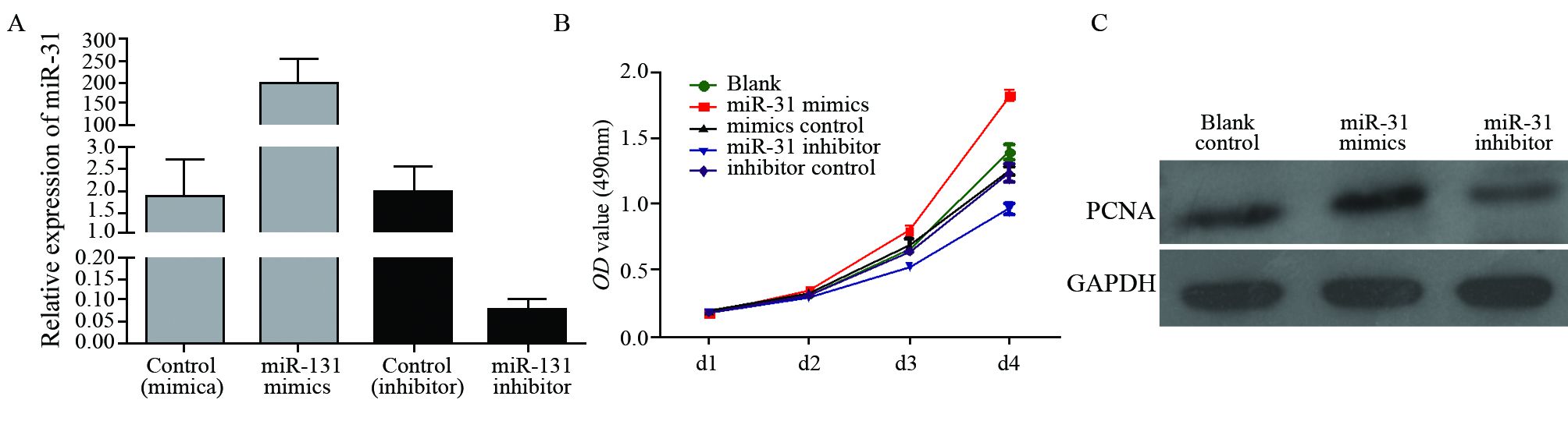 1.2.4 细胞增殖活性的检测(1)转染miR-31mimics组、inhibitor组、miR-Control组及空白对照组结肠癌HCT116细胞株,于转染后24 h消化细胞,分别接种于96孔板。按照MTS细胞增殖检测试剂盒说明,分别于接种96孔板后1、2、3、4 d按每孔20 μl加入MTS检测试剂,在培养箱中继续培养2 h,490 nm测定吸光度(A)值,绘制细胞生长曲线。每组设4个复孔,实验重复3次。(2)细胞转染后24 h,收集提取miR-31 mimics组、inhibitor组及空白对照组三组细胞中总蛋白,行Westernblot检测三组细胞中PCNA蛋白的表达。