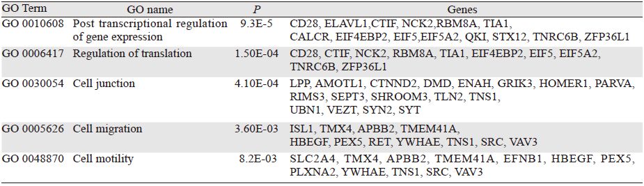 随后对其靶基因进行生物信息学分析,采用TargetScan、miRanda等数据库对其靶基因进行预测,GO分析和KEGG通路分析结果提示:miR-31靶基因功能集中于转录后水平及翻译水平的调节,参与细胞连接、迁移及运动等生物学过程。信号通路主要富集于内吞作用、轴突导向、T细胞受体信号通路、Wnt及MAPK信号通路。了解这些将为我们后期继续研究miR-31的具体作用机制提供一定的方向和理论基础。