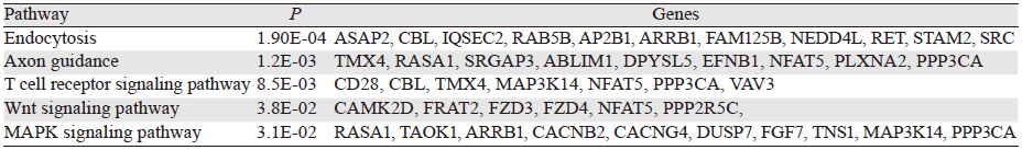 检索TargetScan、DIANA、miRanda、PicTar等数据库,将miR-31预测的靶基因进行GO分析和KEGG通路分析。生物信息学分析结果显示miR-31靶基因功能集中于转录后水平及翻译水平的调节、细胞代谢、细胞连接、迁移及细胞运动等生物学过程。信号通路主要富集于内吞作用、轴突导向、T细胞受体信号通路、Wnt及MAPK信号通路,见表 1、2。