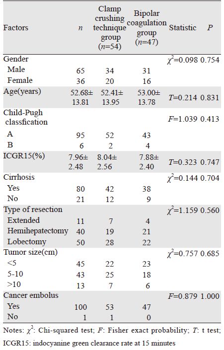 1.3 观察指标根据患者术中离断肝实质的方法分为钳夹法组(54例)与双极电凝组(47例)。统计术中出血量、手术时间、输血情况、术后第一日肝功能指标、术后24 h腹引管引流量、术后并发症情况及肝功能恢复时间。术后第一日肝功能指标包括:血清白蛋白(albumin,ALB)、血清总胆红素(totalbilirubin,TBIL)及血清谷丙转氨酶(alanine aminotransferase,ALT)。术后并发症统计包括术后出血、胆瘘、死亡率、腹水、腹腔感染、肝功能衰竭。肝功能恢复时间采用术后Child-Pugh分级恢复至术前水平的时间。