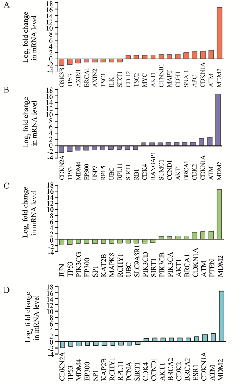 | A: GSK-3β signaling pathway; B: MDM2 signaling pathway; C: pTEN signaling pathway; D: TP53 signaling pathway 图 1 下调PPP2R5C后Jurkat细胞中GSK-3β、MDM2、pTEN、TP53信号通路相关基因表达倍数图 Figure 1 Expression of genes related to GSK-3β, MDM2, pTEN and TP53 signaling pathways after PPP2R5C knockdown in Jurkat cells |
