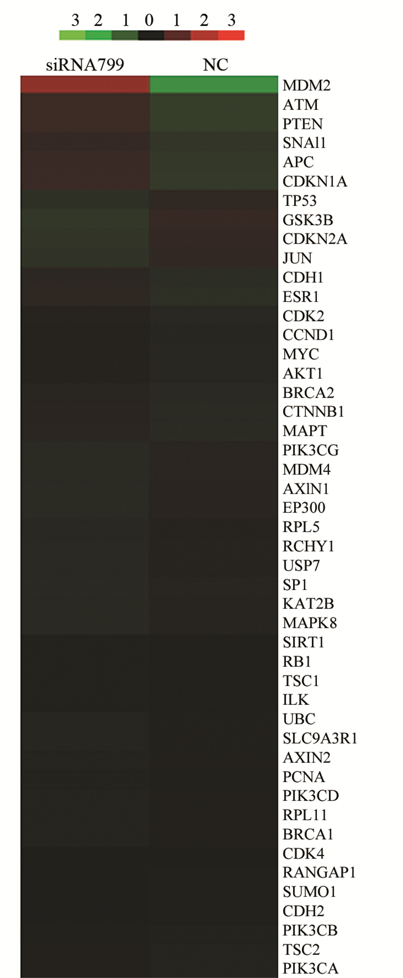 | Notes: 0, 1, 2, 3, -1, -2, -3: The Log values of upregulated or downregulated multiples with genes which corresponds to the color represented; NC: Normal Control 图 2 下调PPP2R5C后Jurkat细胞中GSK-3β、MDM2、pTEN、TP53信号通路相关基因改变热图 Figure 2 Expression of genes related to GSK-3β, MDM2, pTEN and TP53 signaling pathway after ppp2r5c knockdown in Jurkat cells analyzed by microarray technology |
