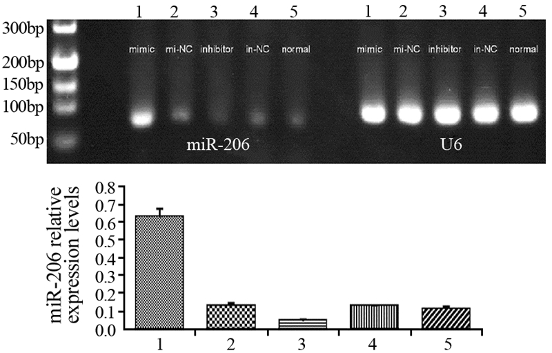 分别稀释miR-206 mimic、miR-206 mimic NC、miR-206 inhibitor、miR-206 inhibitor NC,使终浓度分别为50、50、100和100 nmol/L 。使用ribo FECT CP Reagent进行转染。