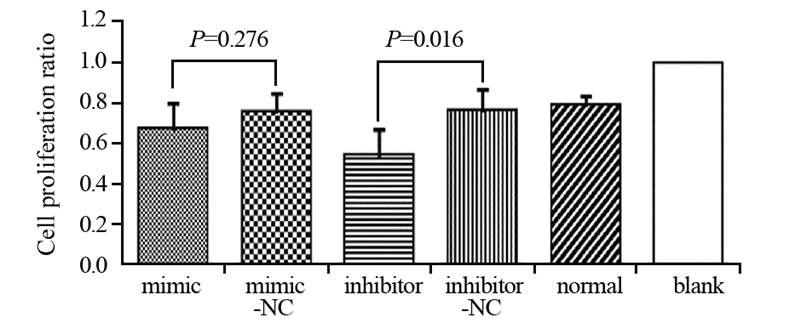 用MTT法检测他莫昔芬对转染后乳腺癌细胞增殖的影响。正常对照组细胞加入TAM及E2。空白对照组仅加入E2。miR-206 mimic组细胞增殖率(0.676±0.121)与miR-206 mimic NC组(0.754±0.009)相比,乳腺癌细胞增殖情况未发生明显改变(t=-1.169, P=0.276)。miR-206 inhibitor组细胞增殖率(0.547±0.123)与miR-206 inhibitor NC组(0.764±0.100)相比,乳腺癌细胞生长抑制作用更为明显(t=-3.054, P=0.016),而正常对照组为(0.790±0.045);空白对照组为1.000,见图 3。