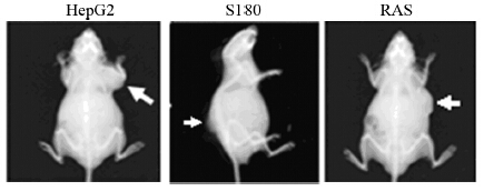 | HepG2: human hepatoma HepG2 cells was subaxillary inoculated into BALB/c-nu-nu mice; S180: sarcoma S180 tumor cells were dorsal subcutaneous transplanted into BALB/c mice; RAS: the liver tumor tissues from H-ras12V transgenic mice was subaxillary inoculated in BALB/c-nu-nu mice; white arrows indicated the subcutaneous tumor 图 1 皮下移植瘤小鼠的X光成像 Figure 1 X-ray imaging of subcutaneous transplanted tumor in mice |
