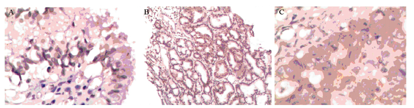 | A: Positive expression of B7-H1 protein in corresponding non-tumor tissues(SP ×400); B: Positive expression of B7-H1 in gallbladder adenoma polyp tissues(SP ×200); C: Positive expression of B7-H1 in gallbladder carcinoma tissues(SP ×400) 图 1 B7-H1蛋白在不同组织中的阳性表达 Figure 1 Positive expression of B7-H1 protein in various tissues |