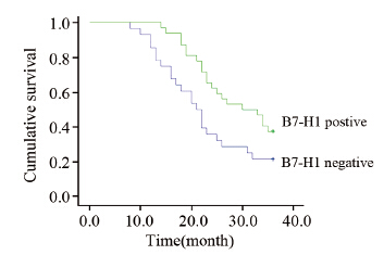 | 图 2 胆囊癌中B7-H1阳性表达组和阴性表达组的Kaplan- Meier生存曲线 Figure 2 Kaplan-Meier survival curves of positive and negative expression of B7-H1 protein in gallbladder carcinoma tissues |
