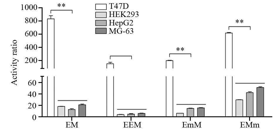 | Activity ratio=firefly luciferase activity/renilla luciferase activity. All data were shown as mean±standard deviation; **: P<0.01; n≥3 图 4 各种MGA启动子在T47D和HEK293T、HepG2、 MG-63细胞中的活性比较 Figure 4 Reporter gene activity of each MGA promoters in HEK293T,HepG2,MG-63 and T47D cells |