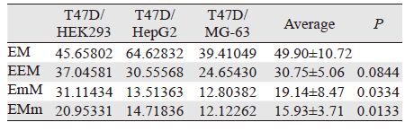1.2.5 裸鼠皮下造瘤及活体成像将106个T47D细胞和T47DEM细胞注射到裸鼠皮下进行造瘤。2周后将D-Luciferin以10 μl/g体重的比例腹腔注射到裸鼠体内,并按照操作说明利用精诺真活体成像系统进行肿瘤活体成像。