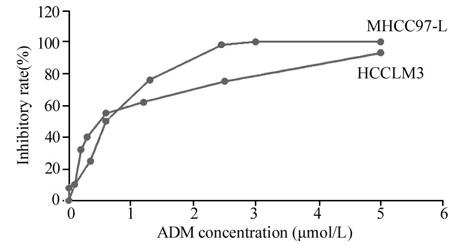 通过分析ADM对不同转移能力肝癌细胞抑制实验的结果,本研究发现ADM对肝癌细胞起到明显抑制作用,且对高转移肝癌细胞系HCCLM3的半数致死量(LD50)要高于低转移肝癌细胞系MHCC97-L,这与临床上早期即发生转移和手术后发生复发转移的肝癌患者具有更高耐药性的现象一致。同时,从图 1抑制曲线可见,当ADM处于低浓度(<0.625 μmol/L)时,相等剂量下ADM对HCCLM3细胞的抑制作用较MHCC97-L更强,但此时药物对肝癌细胞并不能起到明显的杀灭效果,而当ADM浓度逐渐增高(>1.25 μmol/L)时,药物对癌细胞的抑制作用也逐渐增强,但此时高转移能力肝癌细胞系HCCLM3较低转移能力肝癌细胞系MHCC97-L表现出更强的耐药性。