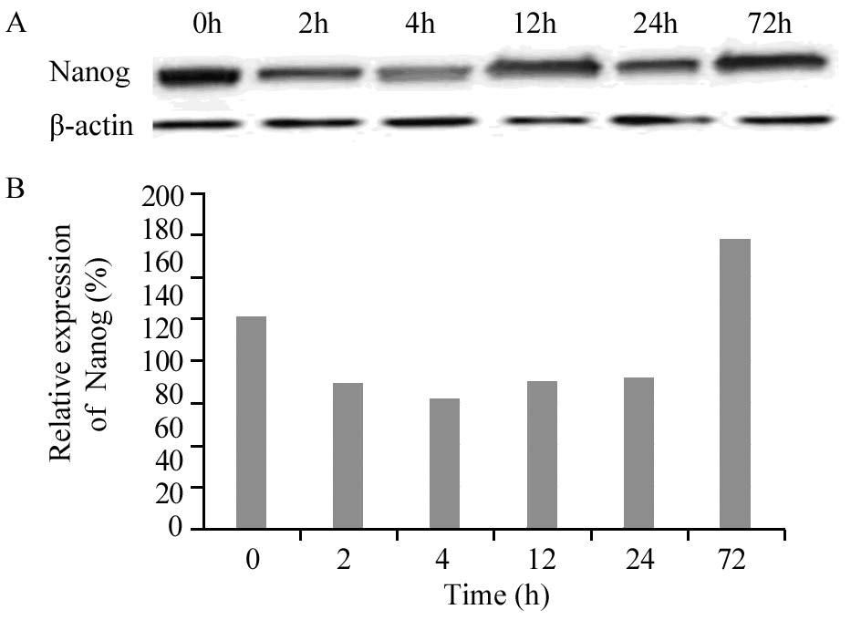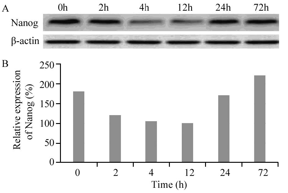 | 图 3 阿霉素作用下MHCC97-L中Nanog的表达 Figure 3 Expression levels of Nanog in MHCC97-L cell line treated with ADM detected by Western blot |